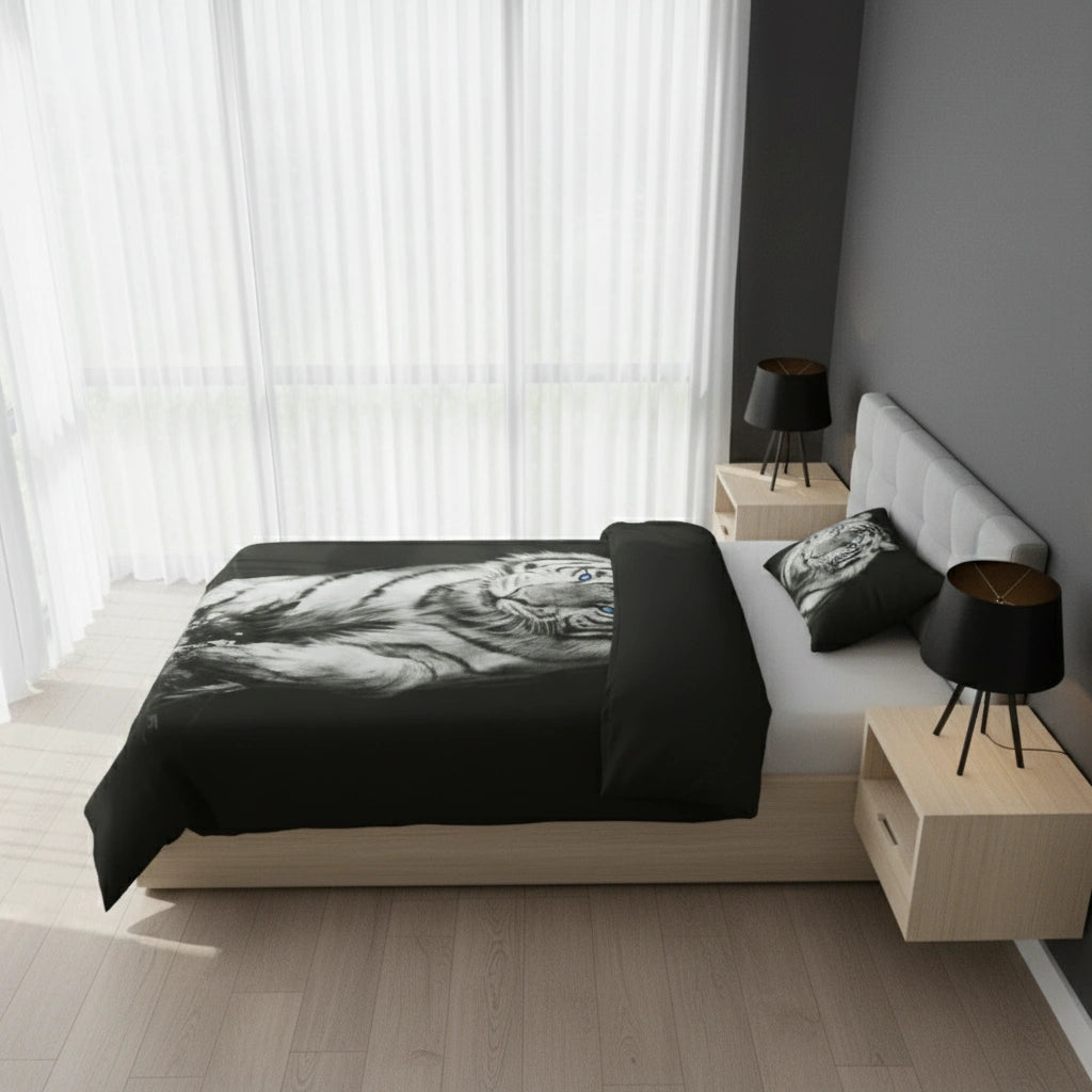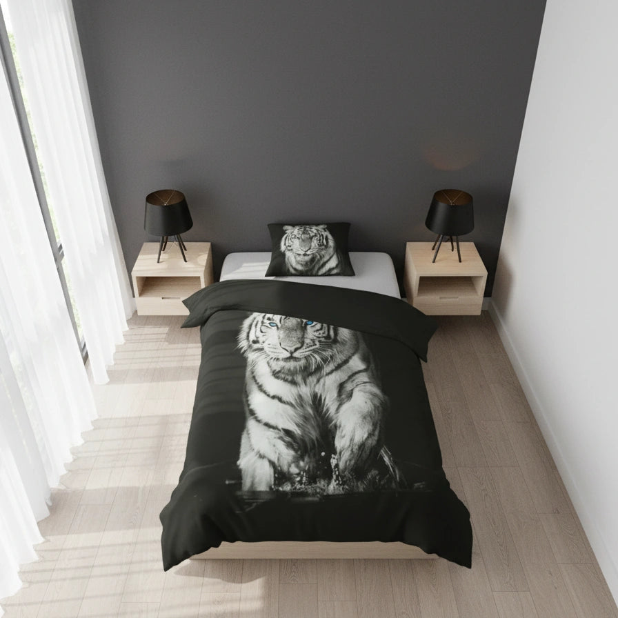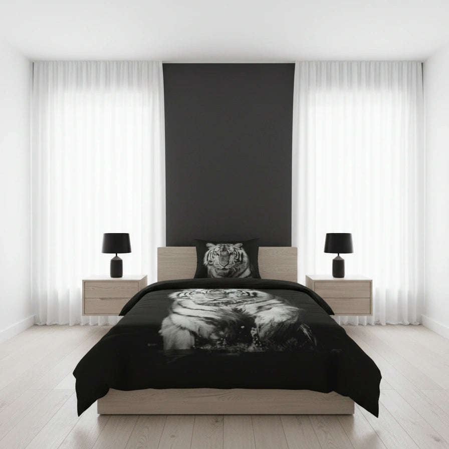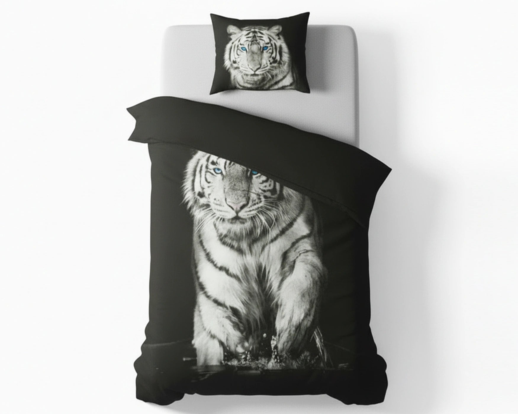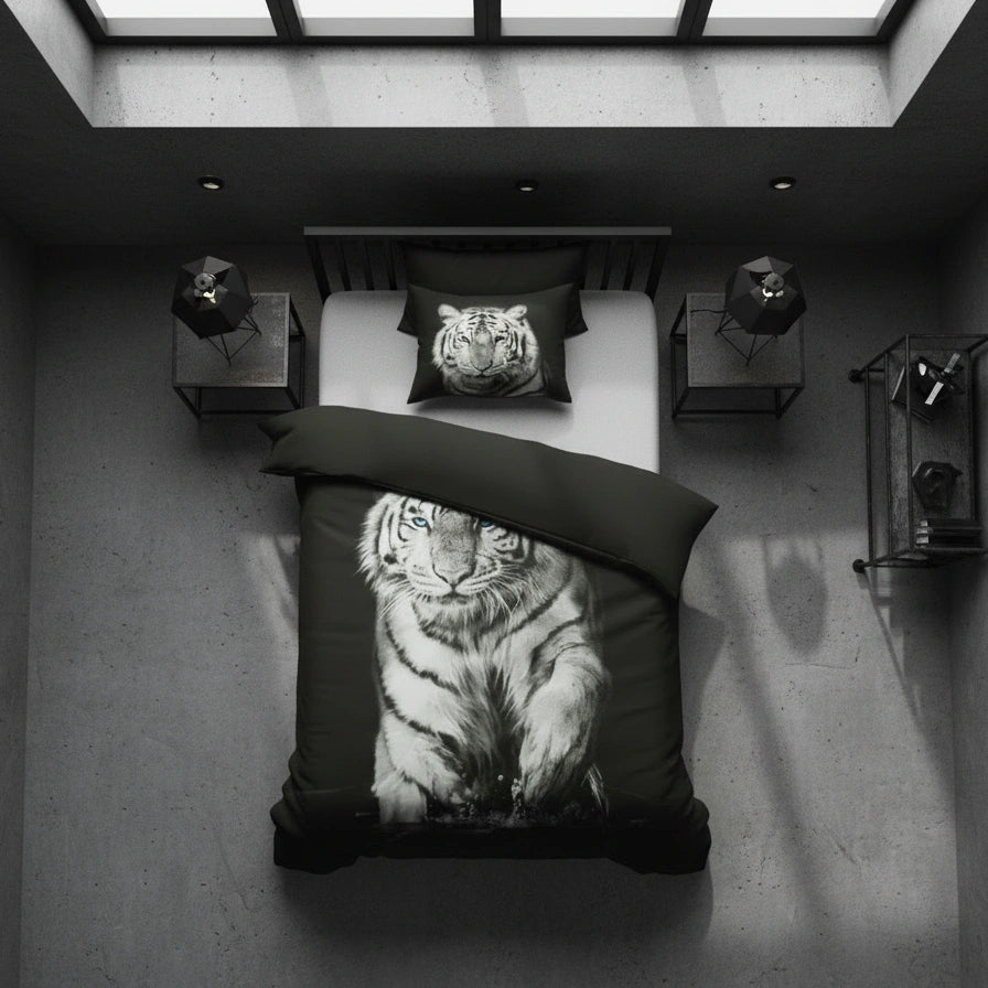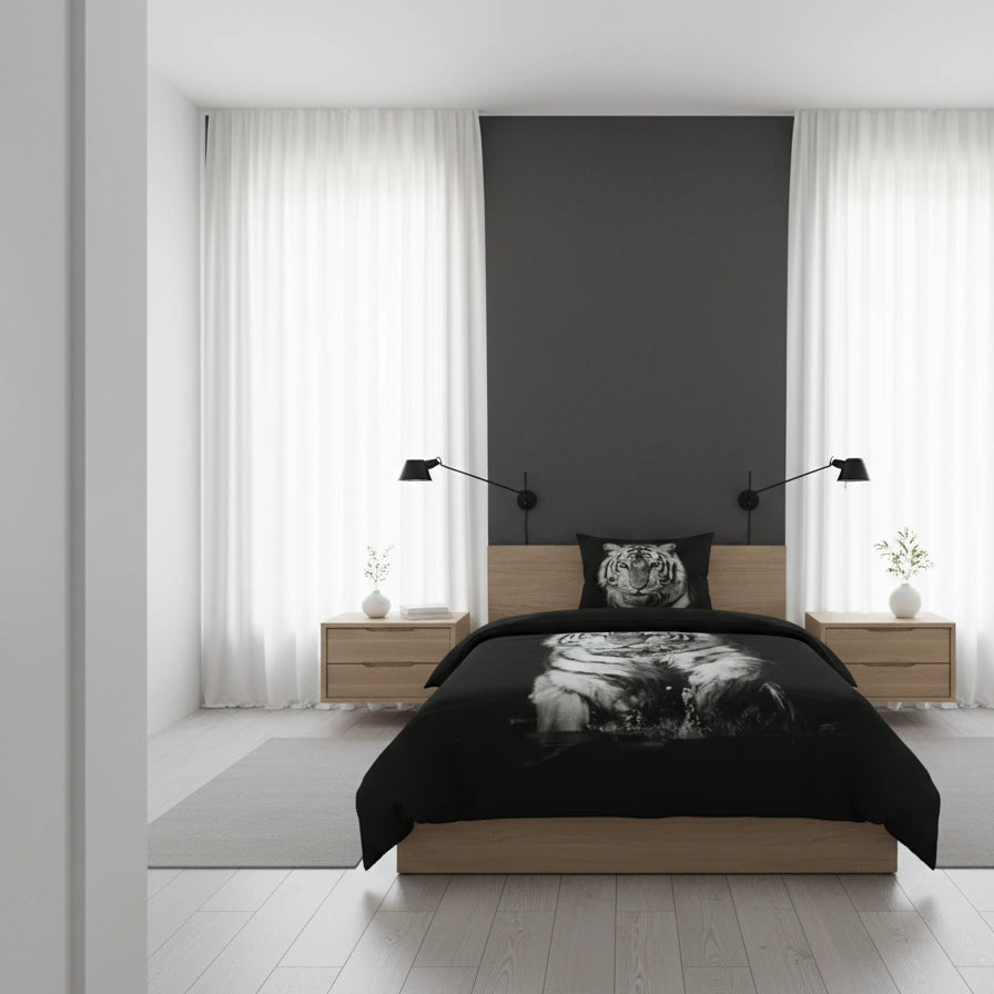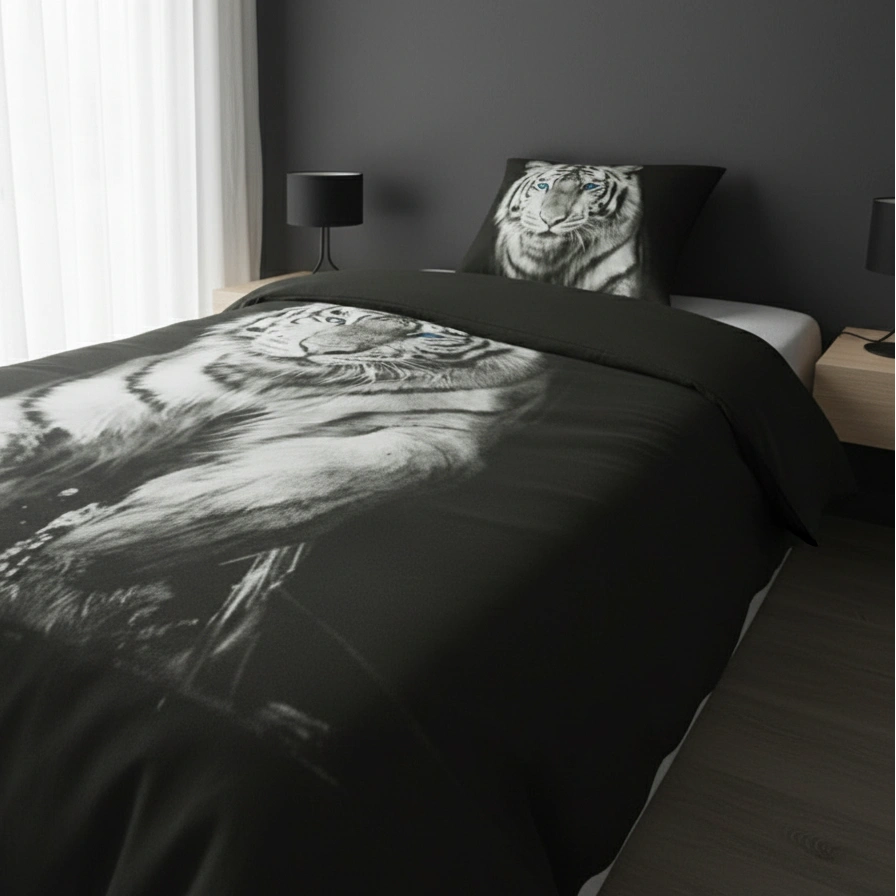 Het Witte Tijger dekbedovertrek in diep zwart geeft elke slaapkamer een krachtige, luxe uitstraling. De indrukwekkende print van een witte tijger met helderblauwe ogen maakt het bed direct het middelpunt van de ruimte. Dit dierenprint dekbedovertrek combineert stoer karakter met moderne verfijning, ideaal voor wie een unieke en stijlvolle sfeer wil creëren.