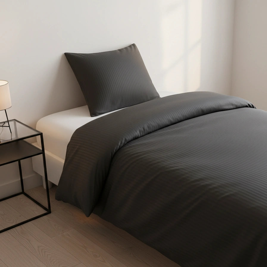 Ervaar de luxe van een hotel in je eigen slaapkamer met dit elegante satijn-katoen dekbedovertrek in diep antraciet. De subtiele 8mm satijnstreep geeft het geheel een rustige glans en een moderne, stijlvolle uitstraling. Een tijdloze kleur die perfect past in zowel minimalistische interieurs als chique slaapkamerstijlen.