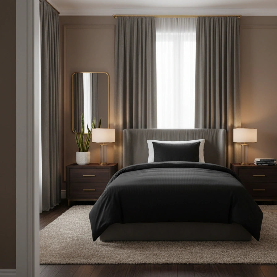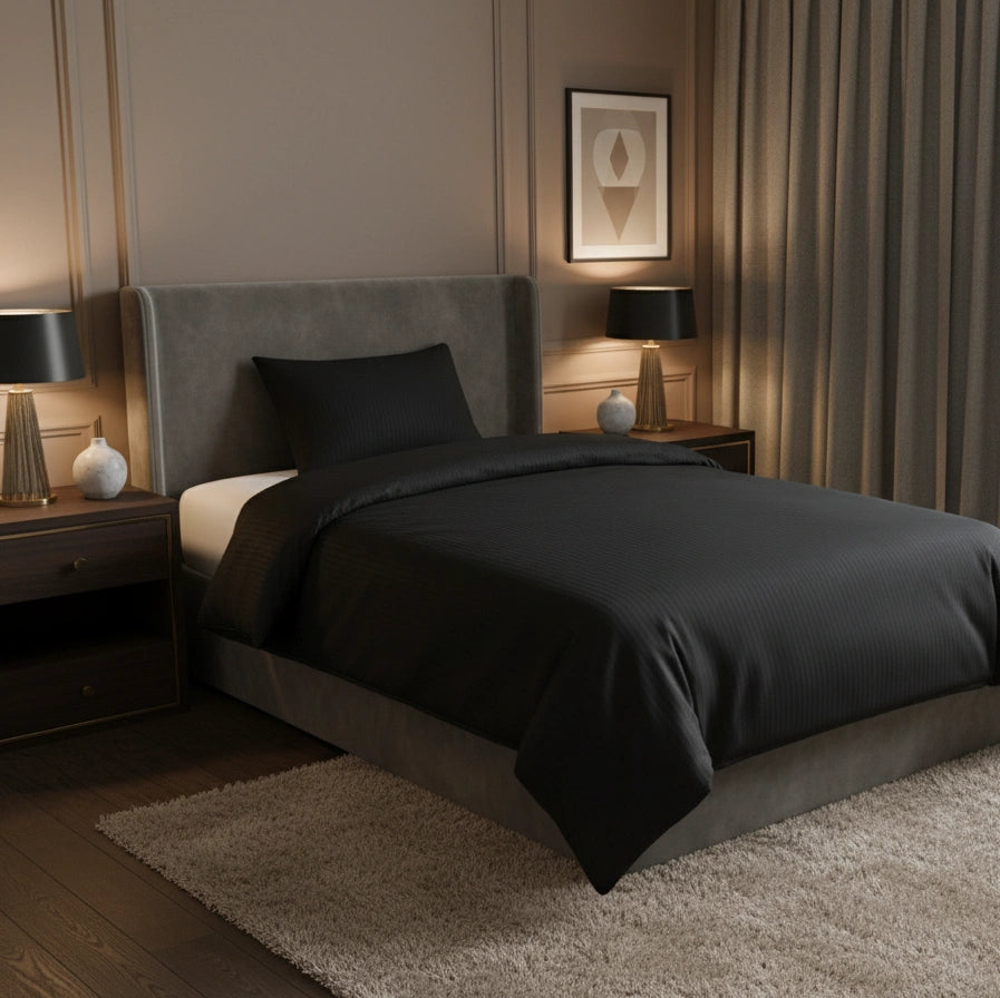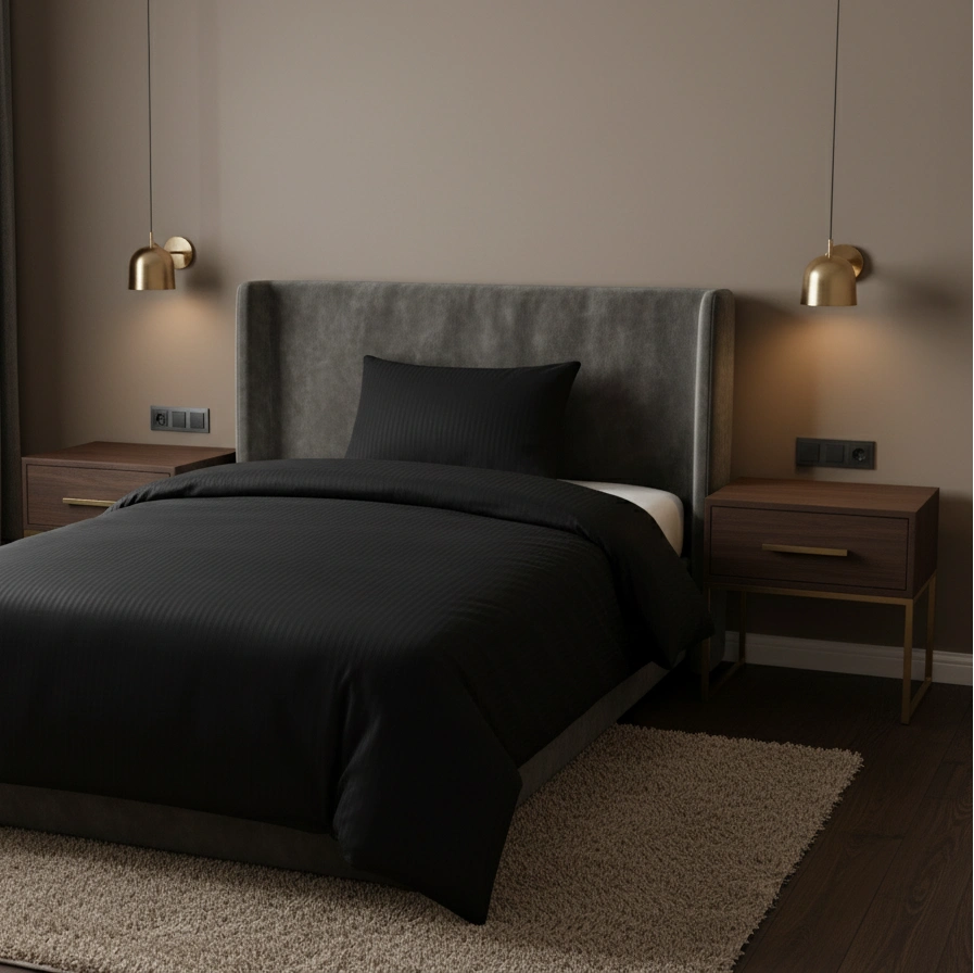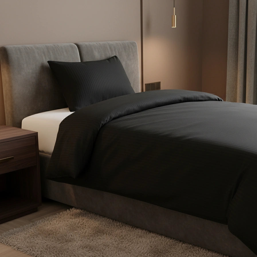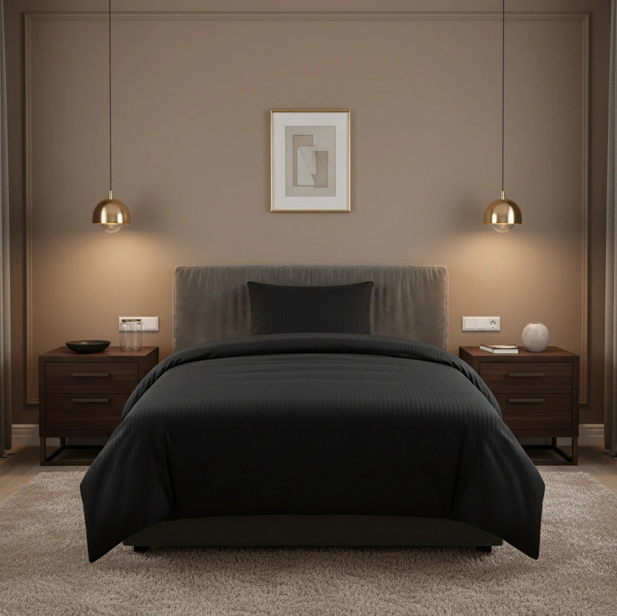 Breng luxe en diepte in de slaapkamer met dit stijlvolle zwarte satijn-katoen dekbedovertrek. De subtiel ingeweven satijnstreep geeft een elegante glans en creëert een krachtige, moderne uitstraling. Een perfecte keuze voor wie houdt van rust, klasse en een strak interieur.