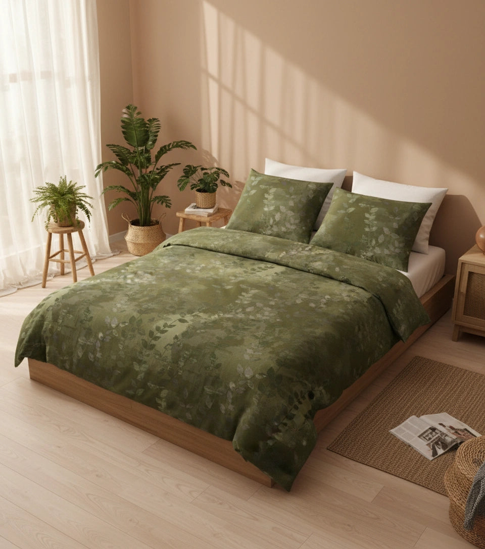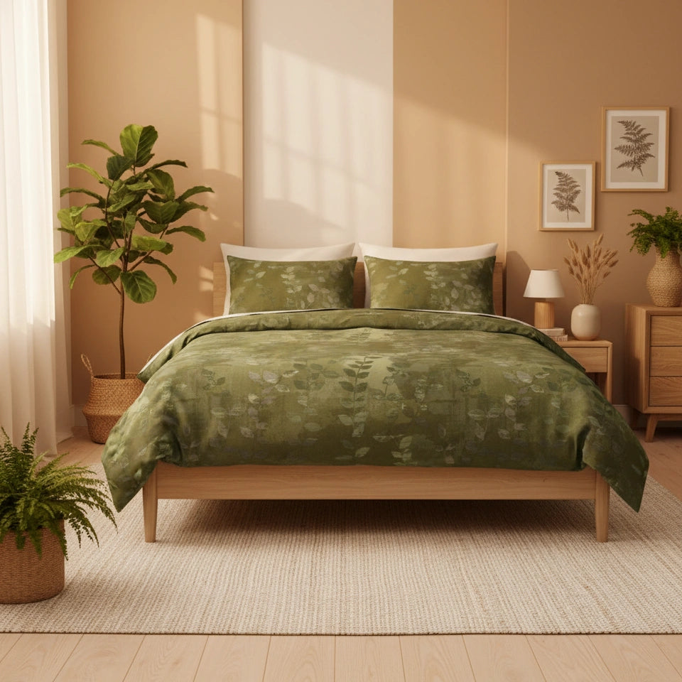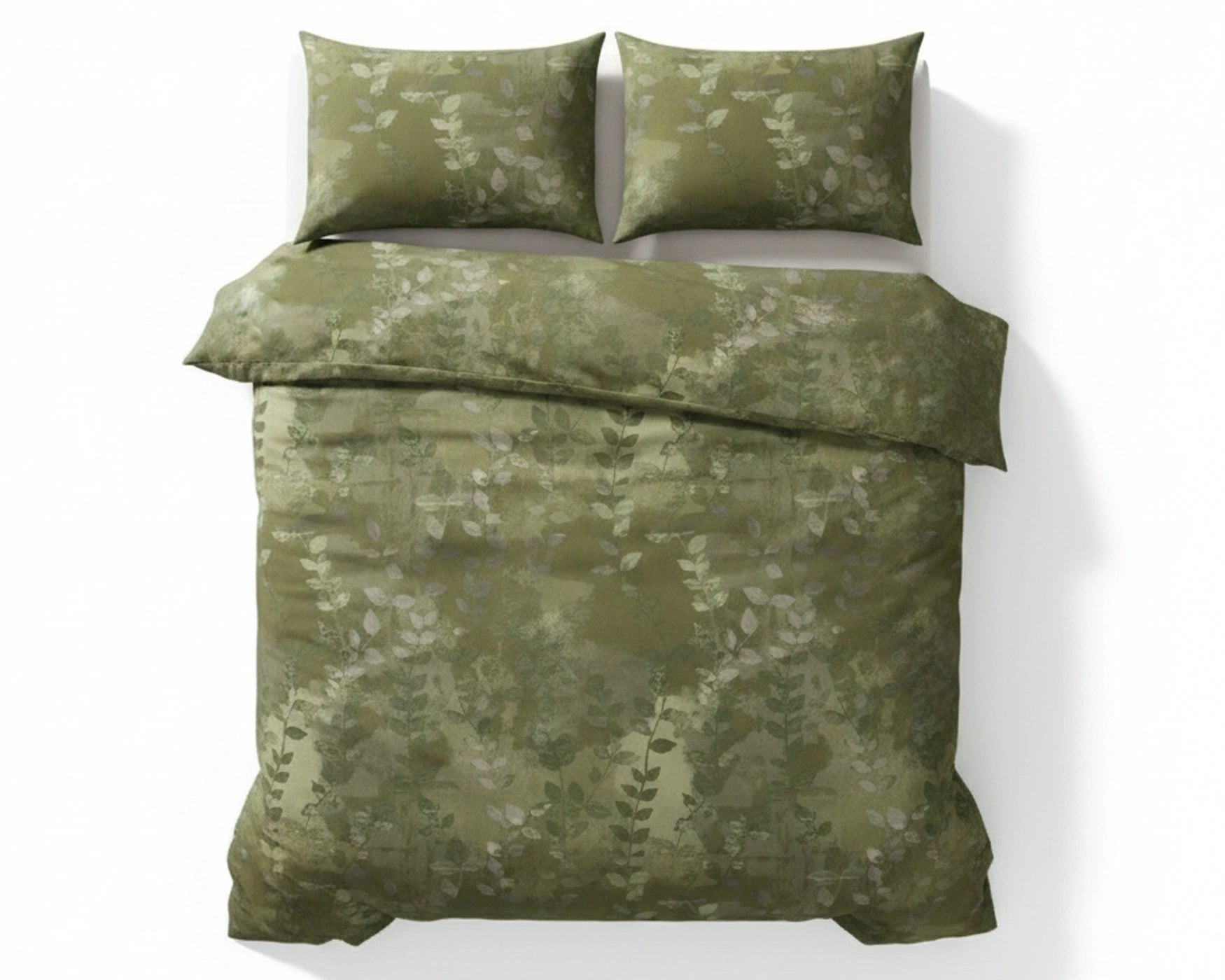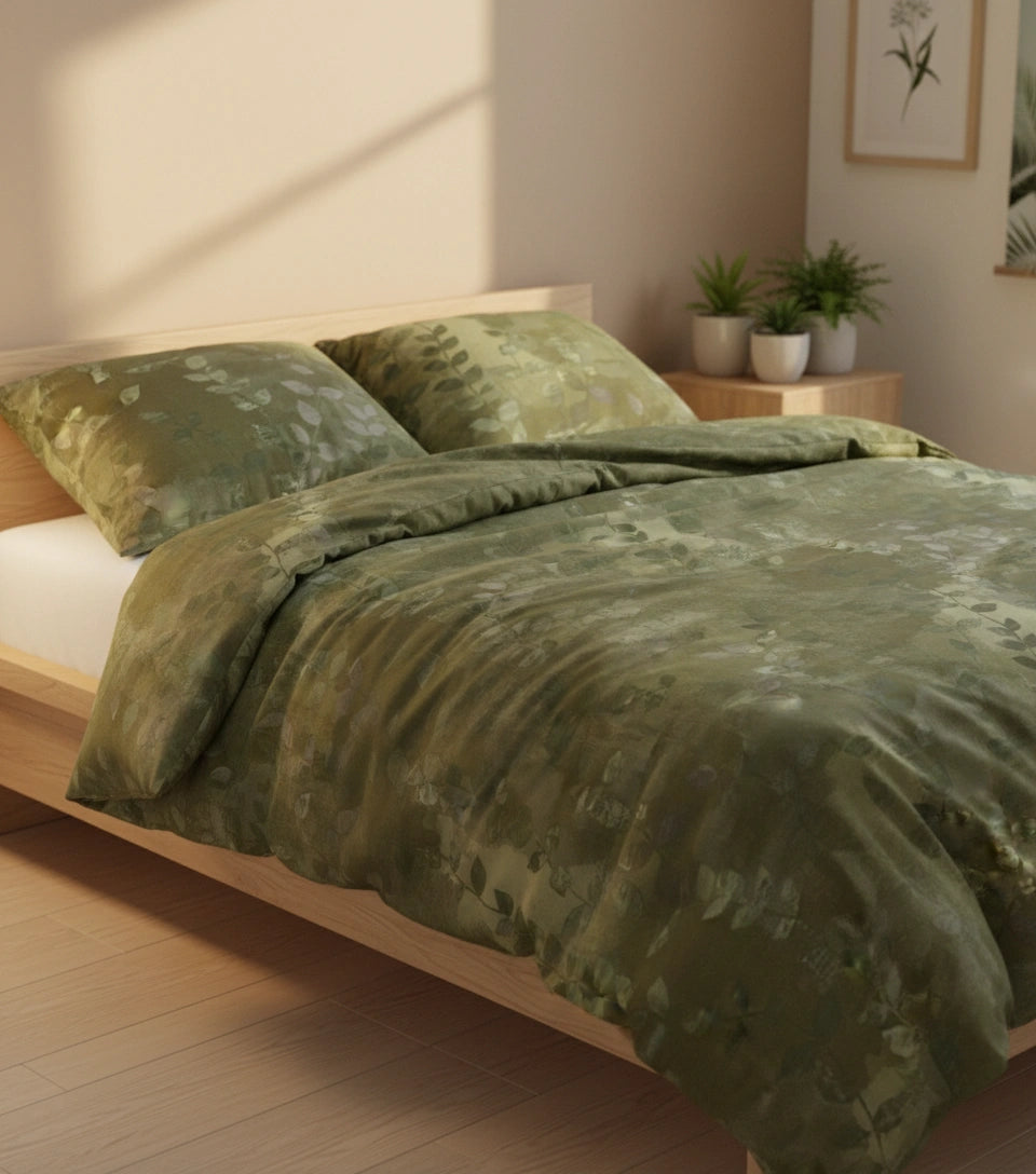 Het groene Leaves dekbedovertrek brengt warmte, natuur en rust in elke slaapkamer. Het prachtige bladmotief in verschillende groentinten creëert een sfeervol en natuurlijk geheel dat direct een ontspannen uitstraling geeft. De zachte kleurcombinatie en het subtiel gelaagde ontwerp zorgen voor een harmonieuze en luxe look die perfect past bij moderne, landelijke en natuurlijke interieurs.