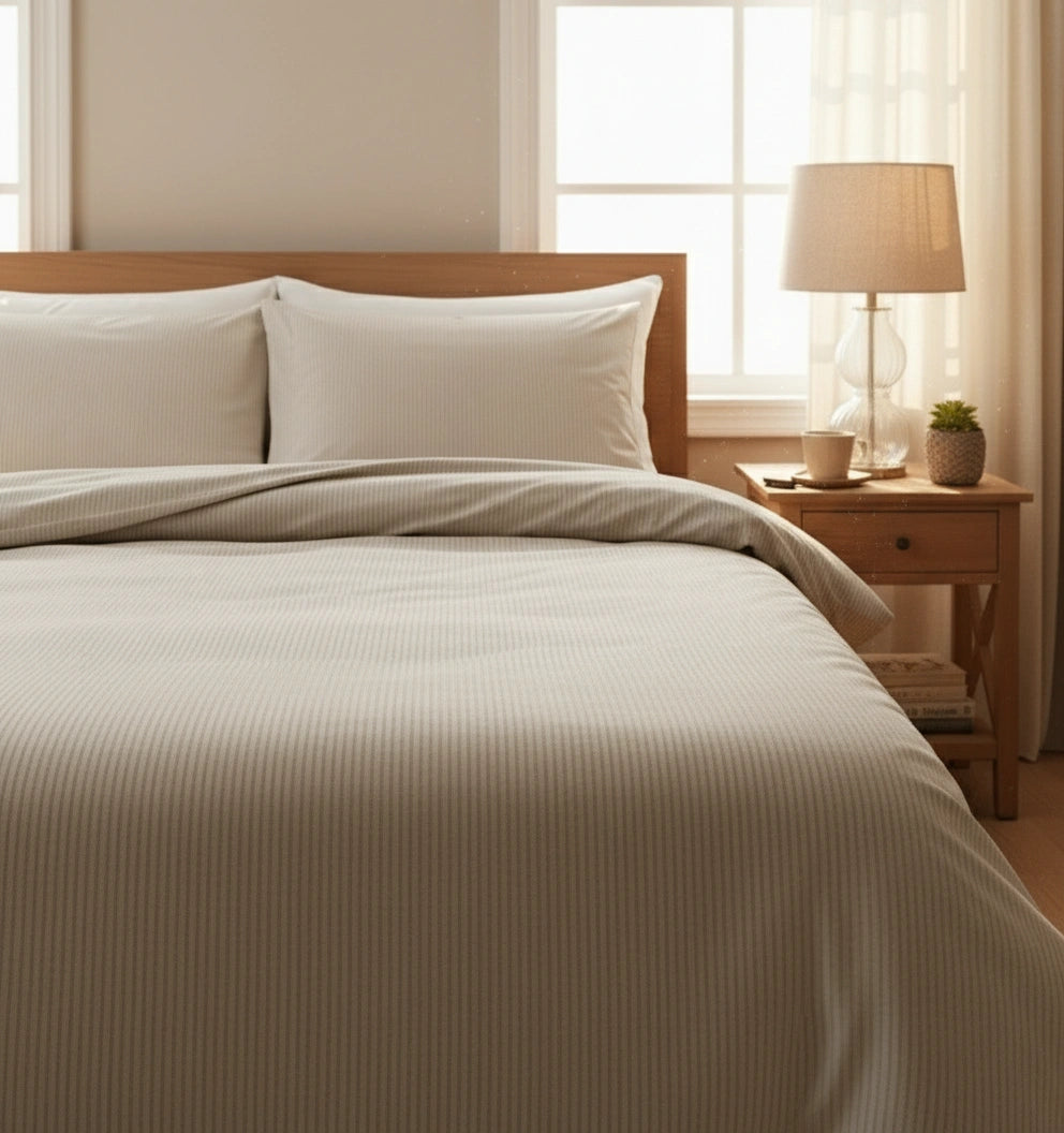 Het lichtgrijs Stripes dekbedovertrek brengt rust, eenvoud en verfijning in elke slaapkamer. De subtiele verticale streepstructuur in zacht lichtgrijs zorgt voor een elegante, tijdloze look die moeiteloos past binnen zowel moderne als klassieke interieurs. De rustige kleur creëert een kalme sfeer en maakt de slaapkamer optisch ruimtelijker.