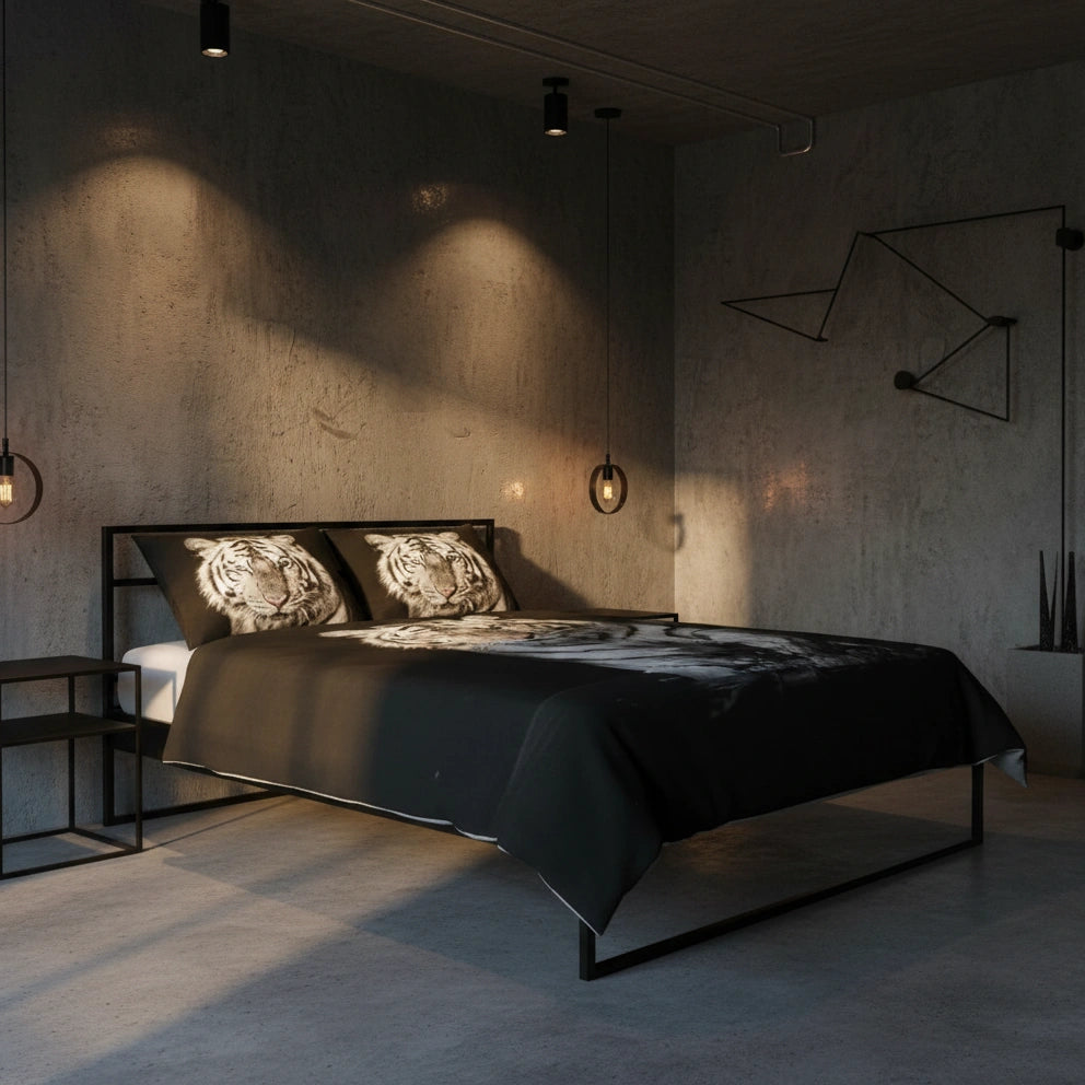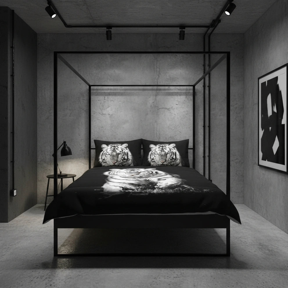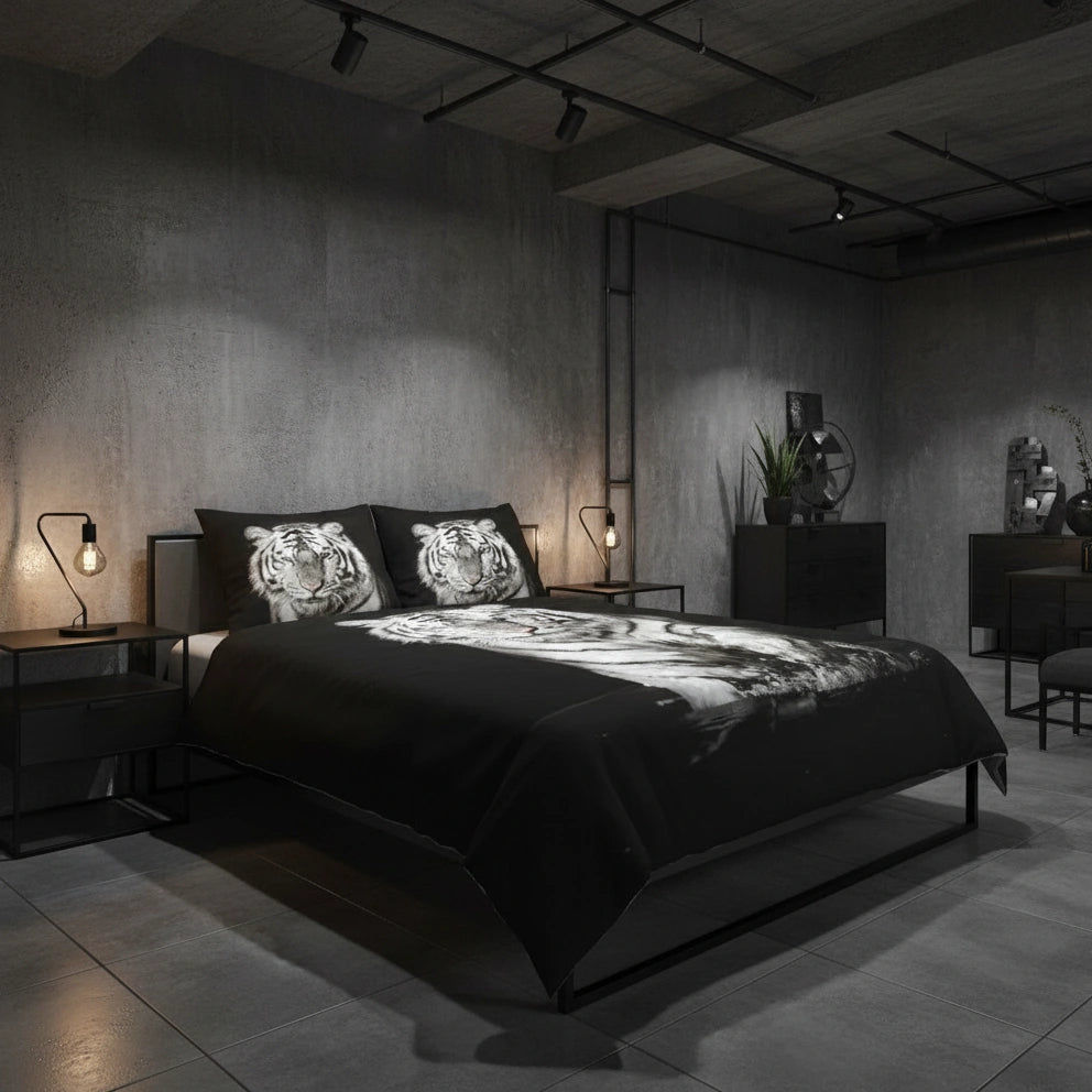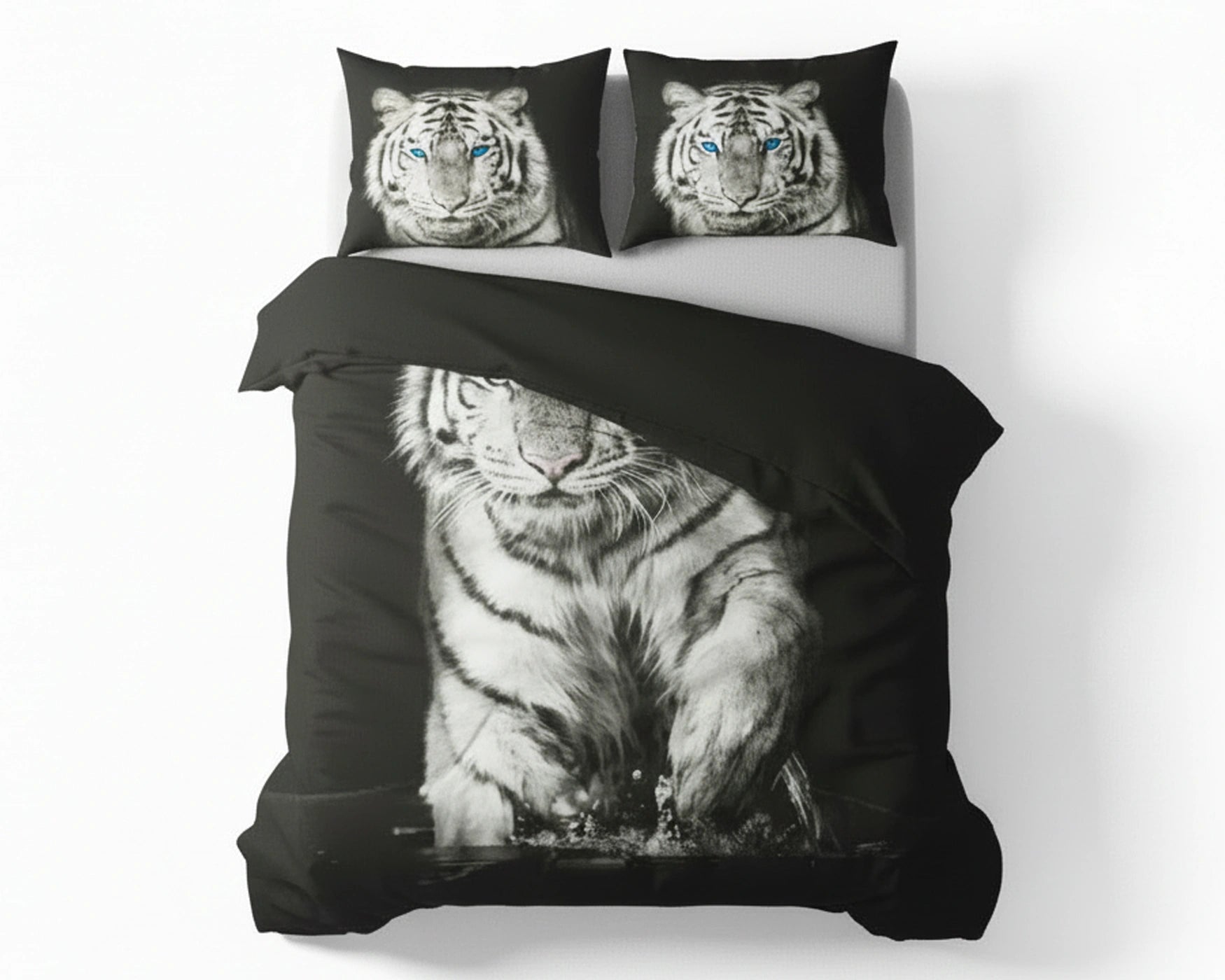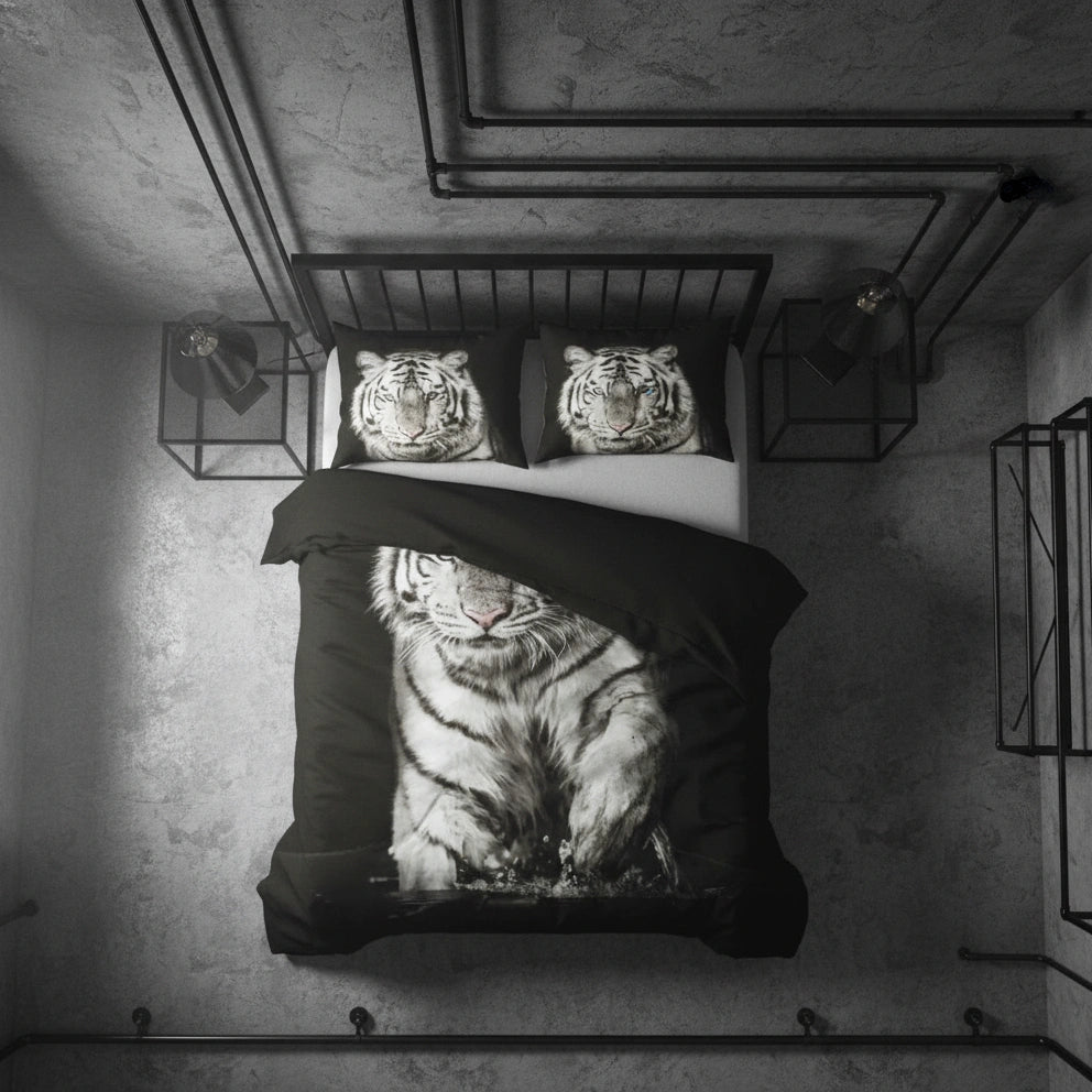 Het Witte Tijger dekbedovertrek in diep zwart geeft elke slaapkamer een krachtige, luxe uitstraling. De indrukwekkende print van een witte tijger met helderblauwe ogen maakt het bed direct het middelpunt van de ruimte. Dit dierenprint dekbedovertrek combineert stoer karakter met moderne verfijning, ideaal voor wie een unieke en stijlvolle sfeer wil creëren.