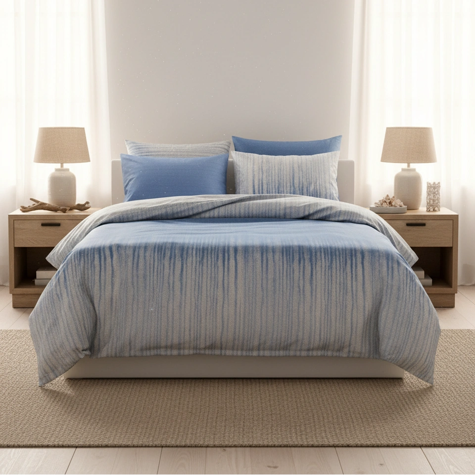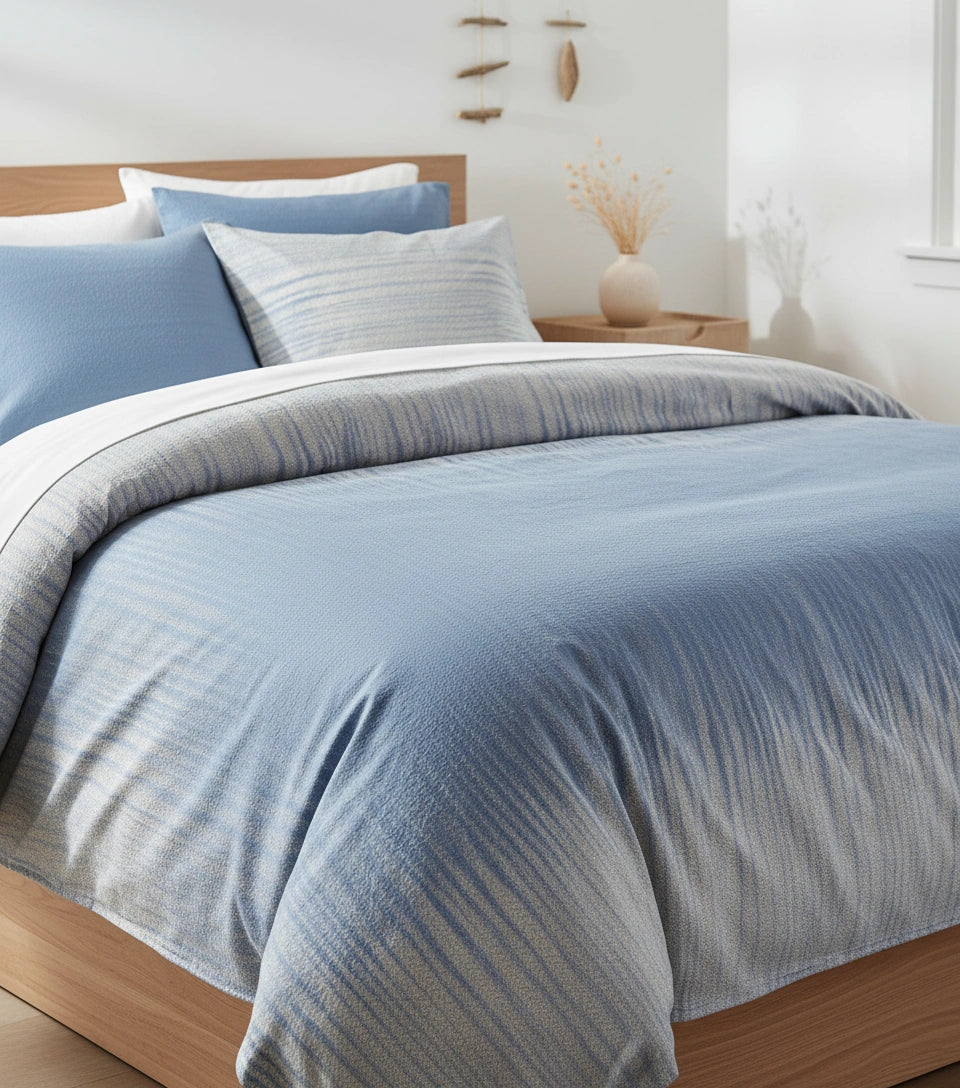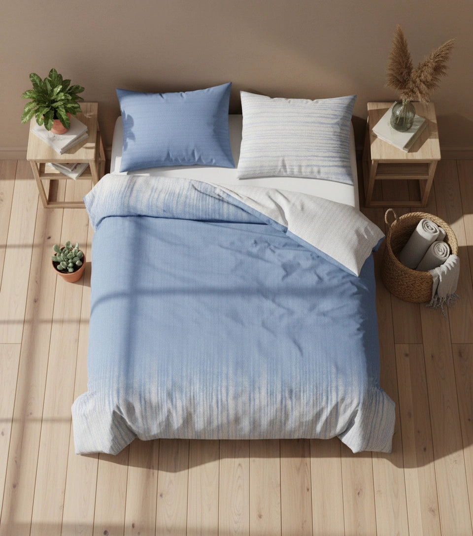 Het blauw-witte Classic dekbedovertrek brengt een frisse en rustige sfeer in de slaapkamer. De zachte overgang van licht- naar middenblauw in combinatie met het subtiele streeppatroon creëert een moderne, kalme uitstraling die meteen uitnodigt tot ontspannen. De elegante grijs-blauwe tinten passen prachtig binnen zowel minimalistische als klassieke interieurs en geven het bed een verfijnde, hotelwaardige look.