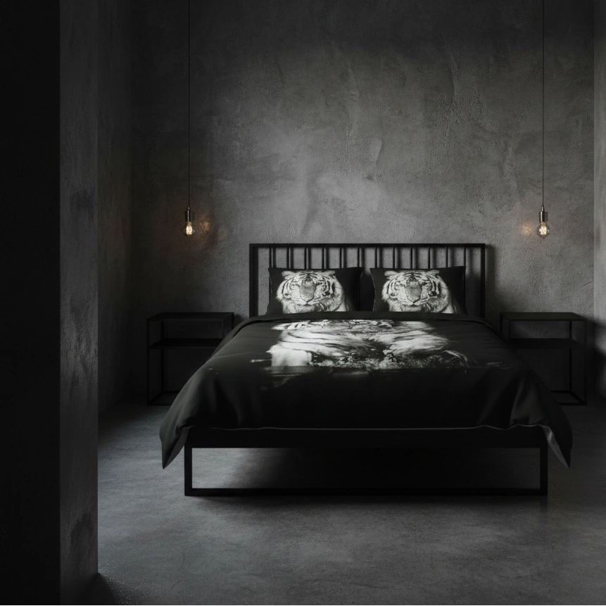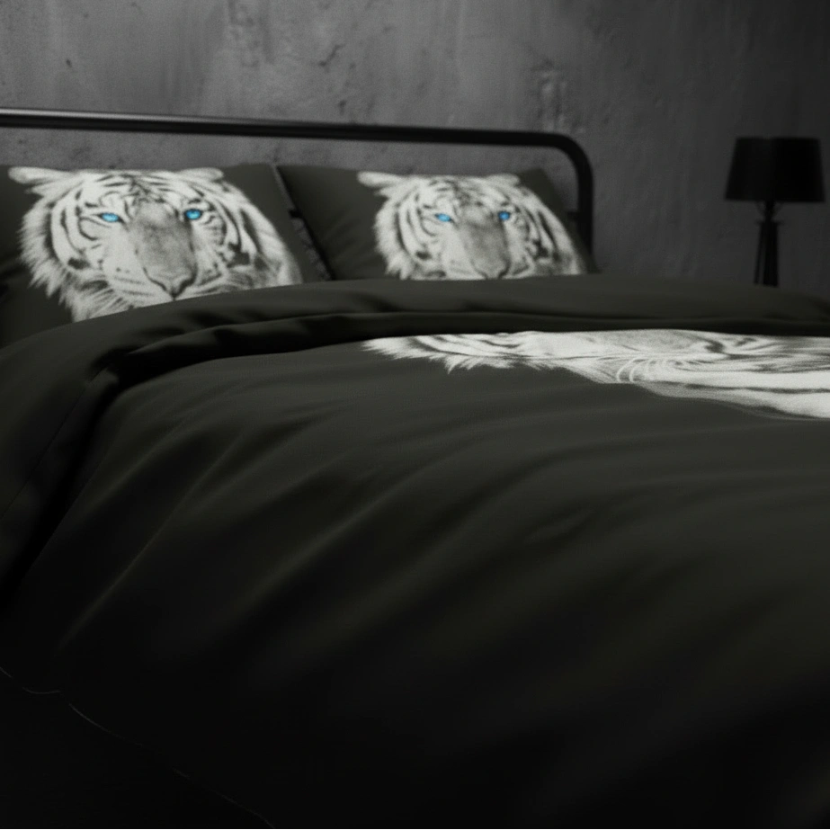 Het Witte Tijger dekbedovertrek in diep zwart geeft ruime slaapkamers een krachtige, luxe uitstraling. De indrukwekkende print van een witte tijger met helderblauwe ogen maakt het bed direct het middelpunt van de ruimte. Dit dierenprint dekbedovertrek combineert stoer karakter met moderne verfijning en is ideaal voor wie een unieke en stijlvolle sfeer wil creëren.