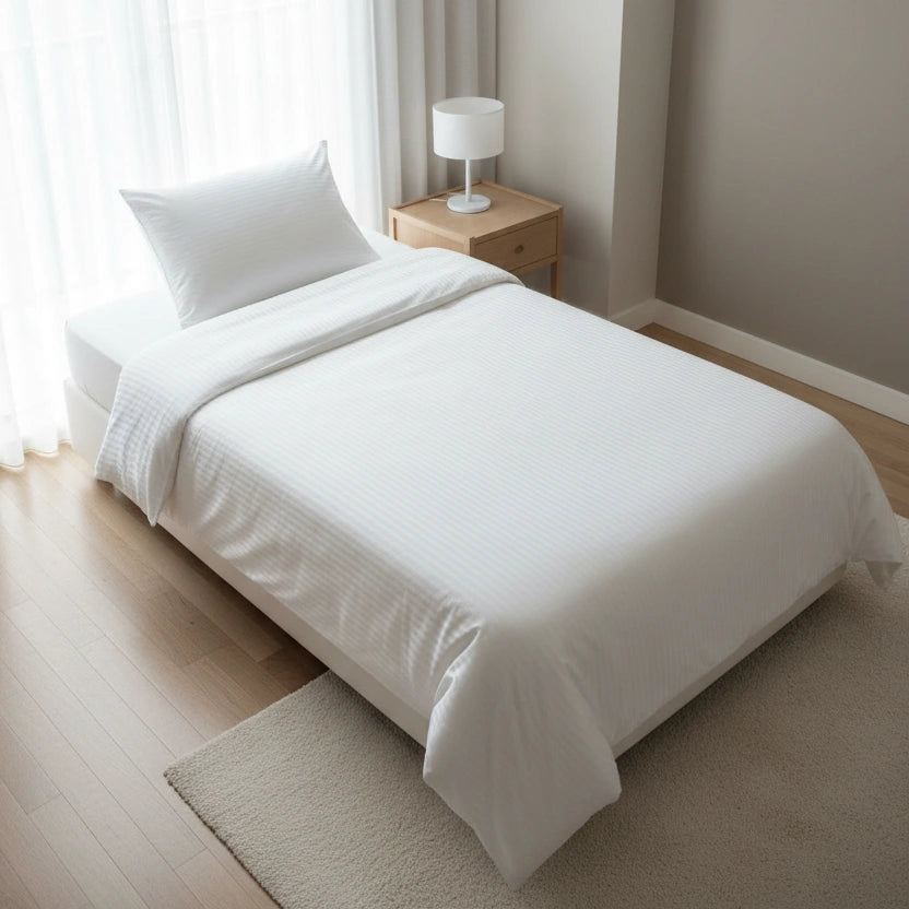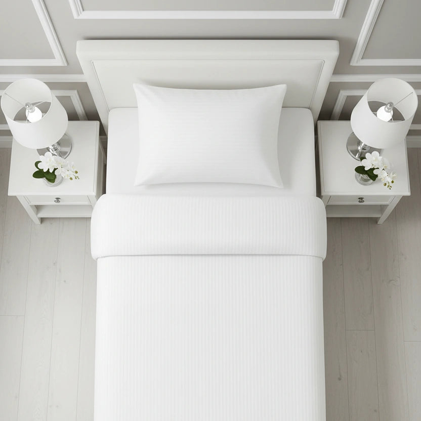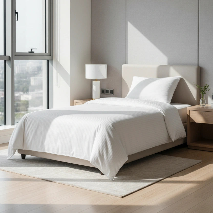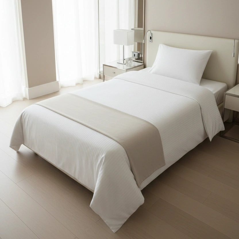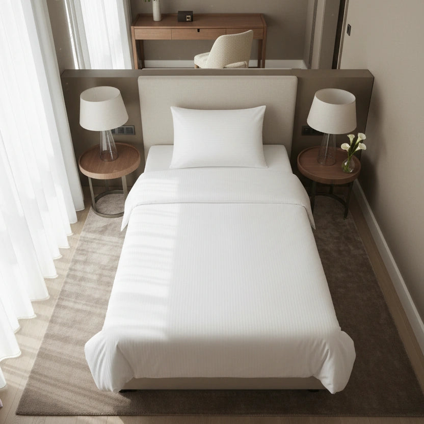 Dit eenpersoons dekbedovertrek is ontwikkeld voor professioneel gebruik in hotels en B&B’s, waar beddengoed vaak wordt gewassen en er elke dag een strak, fris bed moet liggen. De 10mm satijnstreep geeft een rustige hoteluitstraling, terwijl de katoenmix (80% katoen/ 20% polyester) helpt om het overtrek vormvast, sterk en netjes te houden, ook bij intensief gebruik. Zo haal je thuis dezelfde verzorgde hotelbasis in huis: comfortabel, praktisch en langdurig mooi.