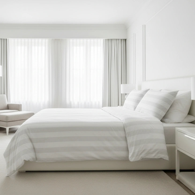 De 27 mm satijnstreep geeft het dekbedovertrek een meer uitgesproken, maar nog steeds rustige hoteluitstraling. Deze bredere streep wordt vaak gekozen in hotels die net iets meer uitstraling willen, zonder in te leveren op professionaliteit. De subtiele glans blijft ook na veelvuldig wassen zichtbaar en zorgt voor een verzorgd en strak bedbeeld.