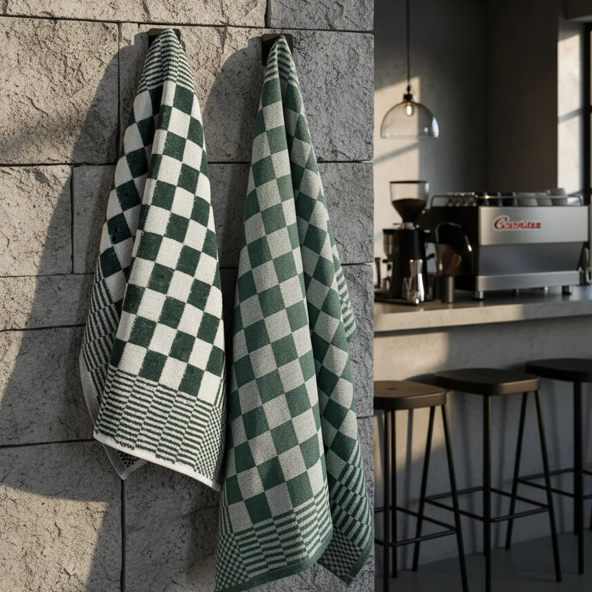 Professionele badstof keukenhanddoeken van 100% katoen in groen. Zacht, sterk en zeer absorberend, ideaal voor intensief gebruik in horecakeukens én voor consumenten die thuis dezelfde betrouwbare kwaliteit willen.