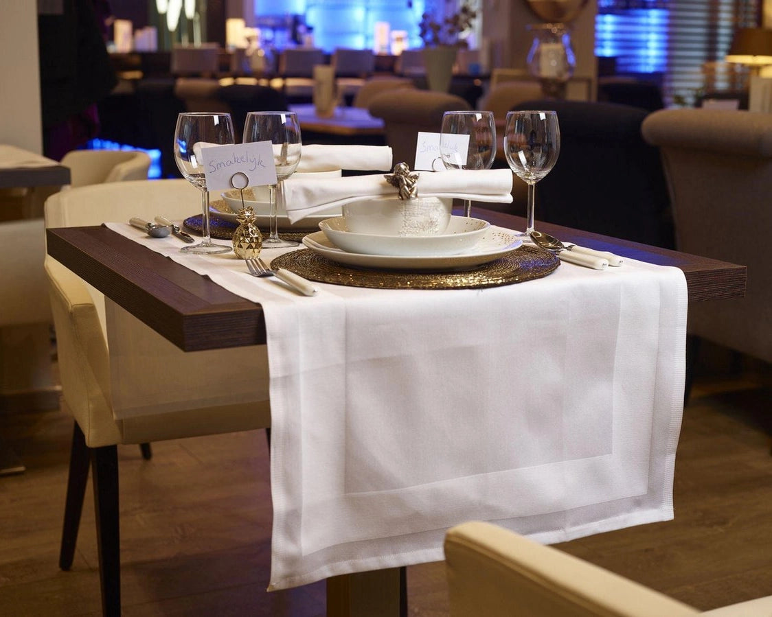 De damast weving met satijnband zorgt voor een subtiel klassiek detail dat past bij zowel professionele tafelaankleding als een rustige, stijlvolle tafel thuis.