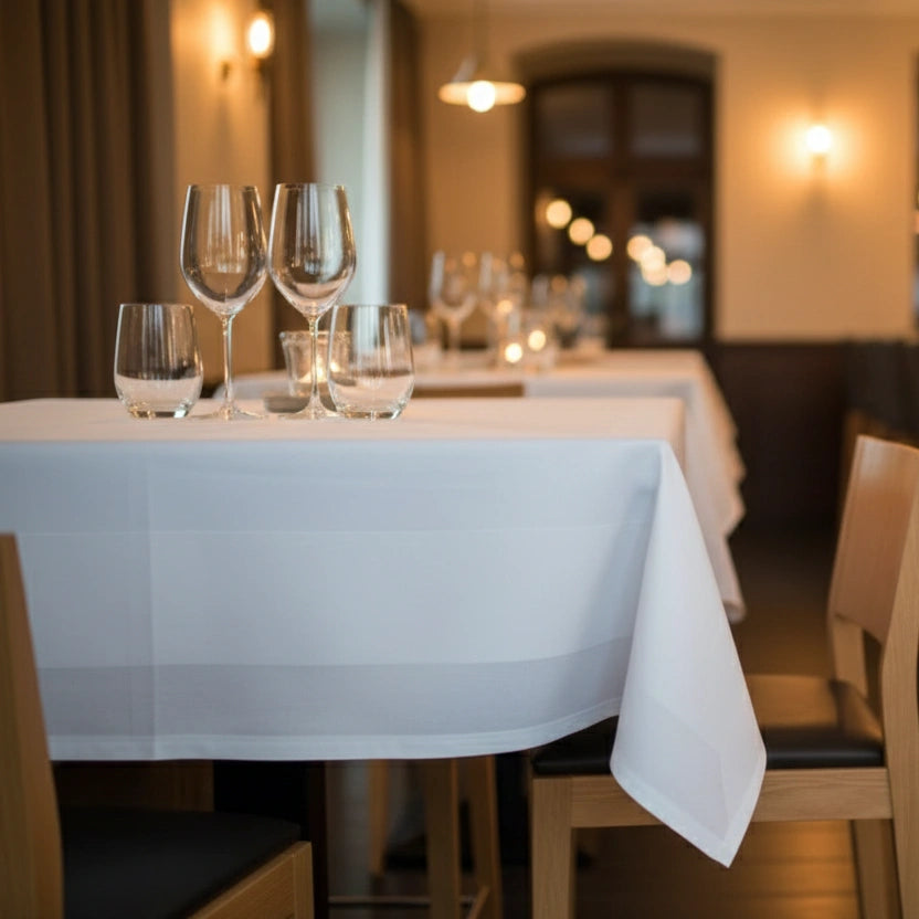 Dit tafelkleed maakt deel uit van professioneel tafellinnen dat dagelijks wordt gebruikt in restaurants en horecagelegenheden, waar duurzaamheid, vormvastheid en een verzorgde uitstraling essentieel zijn.